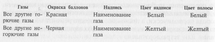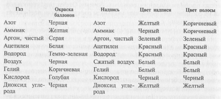 Наружная поверхность баллонов окрашивается в определенный цвет, на нее наносится соответствующая надпись и сигнальная полоса. Окраска баллонов для наиболее часто используемых промышленных газов приведена ниже: