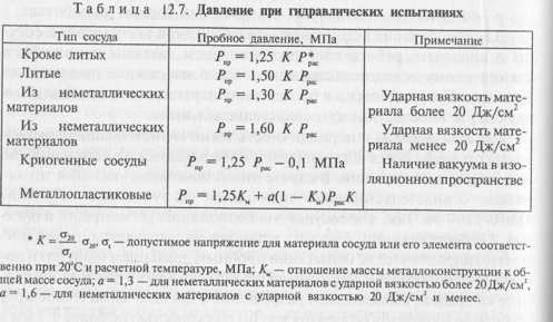 При гидравлических испытаниях емкость заполняют водой, после чего давление воды плавно повышают до значений пробного давления, указанного в табл. 12.7.