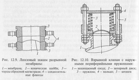 Распространенным средством защиты технологического оборудования от разрушения при взрывах являются предохранительные мембраны (разрывные, ломающиеся, срезные, хлопающие, специальные) и взрывные клапаны (рис. 12.9, 12.10).