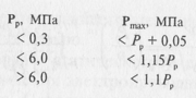 асчет и подбор предохранительного клапана заключается в определении количества газа (жидкости), вышедшего из сосуда, аппарата, или площади проходного сечения предохранительного устройства, а также расчете времени истечения при заданном конечном давлении. Давление Рmax защищаемой емкости не должно превышать значений, указанных ниже: