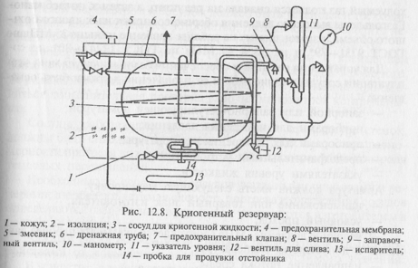 Транспортные сосуды (цистерны) обычно имеют объем до 35 тыс. л. Принципиальная схема такого резервуара представлена на рис. 12.8. Низкие температуры, при которых эксплуатируются внутренние сосуды криогенных резервуаров и цистерн, накладывают ограничения на материалы, используемые при их изготовлении.