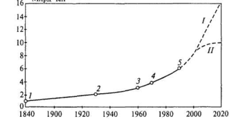 /—рост численности до 28—30 млрд человек к 2070—2100 гг, //—стабилизация численности на уровне 10 млрд человек