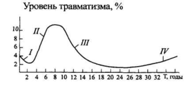 дового стажа. Характер изменения травматизма в начале трудовой деятельности /обусловлен отсутствием достаточных знаний и навыков безопасной работы в первые трудовые дни и последующим приобретением этих навыков. Рост уровня травматизма при стаже 2...7 лет (II) объясняется во многом небрежностью, халатностью и сознательным нарушением требований безопасности этой категорией работающих. При стаже 7...21 год динамика травматизма (III) определяется приобретением профессиональных навыков, осмотрительностью, правильным отношением работающих к требованиям безопасности. Для зоны IV характерно некоторое повышение травматизма, как правило, обусловленное ухудшением психофизического состояния работающих.