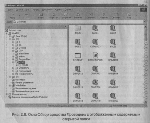 На рис 2.8 изображено открытое окно средства Проводник (как видно из рисунка, окно называется Обзор, а не Проводник) с иерархическим списком папок, выведенным в левой его части. Одна из папок на левой панели "открыта". Содержание именно этой папки отображается на правой панели. Списки файлов и папок можно прокручивать с помощью полос прокрутки, которые имеются на обеих панелях.