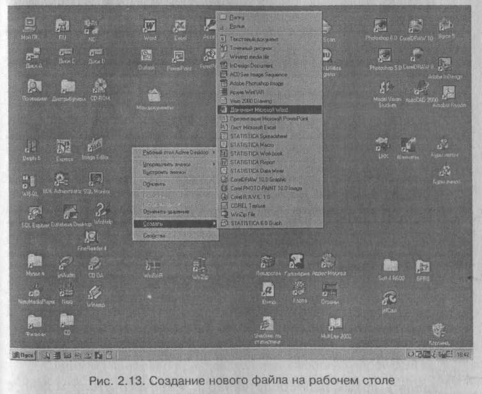 Создание нового файла на рабочем столе. Чтобы создать новый файл на рабочем столе, щелкните правой кнопкой мыши в любом незанятом месте и выберите из появившегося меню команду Создать. Выберите тип файла, который хотите создать (рис. 2.13). На экране появится файл с курсором внутри текстовой области для ввода имени файла.