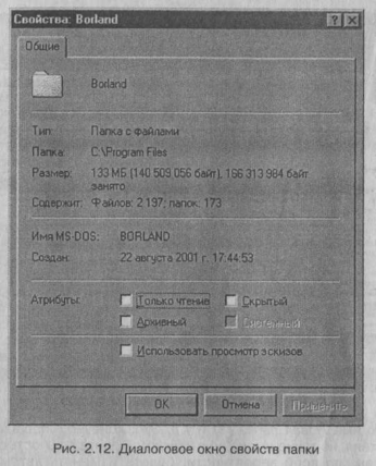 Папки, как и другие элементы Windows 98, имеют диалоговые окна свойств. Щелкните правой кнопкой мыши на какой-либо папке и выберите в появившемся меню пункт Свойства, в результате чего на экране появится диалоговое окно, похожее на изображенное на рис. 2.12.