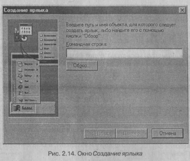 Еще один способ создания ярлыков на Рабочем столе основан на использовании специальной программы создания ярлыков, которая может быть запущена не только с панели каталога, но и непосредственно с Рабочего стола. Для этого следует выполнить команду Создать | Ярлык контекстного меню Рабочего стола (оно вызывается щелчком правой клавиши по свободному полю Рабочего стола).