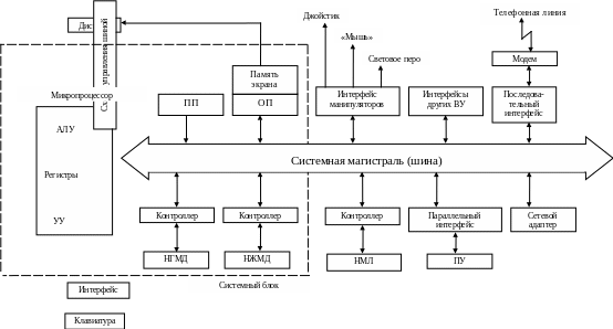 ЭВМ, как правило, имеет модульную структуру (рис. 1.4). Все модули связаны с системной магистралью (шиной).