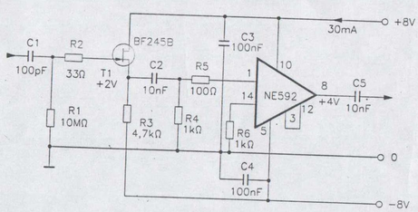 Блок 24-канального видеоусилителя используется для усиления сигналов с видеокамер на орбитальной космической станции. Электрическая принципиальная схема для одного канала, основанная на микросхеме NE592, приведена на рисунке 1.