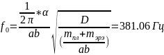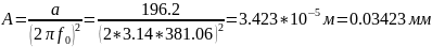 , где а=196.2 м/с^2 – ускорение при вибрации (значение взято из ТЗ), f0=381.06 Гц – резонансная частота конструкции., тогда