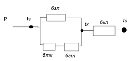 Учитывая, что блок разрабатываемого усилителя будет располагаться на орбитальной космической станции, следовательно, передача тепла конвекцией будет отсутствовать. Также, учитывая что толщина корпуса блока лежит в пределах от 0 до 2мм, следует, что можно пренебречь теплопроводностью между его внутренней и внешней поверхностью. Таким образом, можно составить упрощенную схему теплопередачи (рисунок 7).