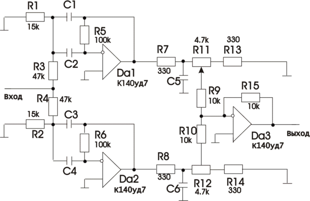 АЧХ полосового фильтра формируется перемножением амплитудно-частотных характеристик двух узкополосных фильтров, центральные частоты которых разнесены. Формирование АЧХ DA1 происходит с помощью конденсаторов С1 и С2 и резистора R3. Формирование АЧХ DA2 происходит с помощью конденсаторов С3 и С4 и резистора R4. Повторитель выполнен на микросхеме К140УД7. Подстройка его АЧХ производится с помощью резисторов R11 и R12. Питание схемы производится источником в 24 В.