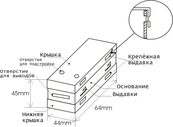 Крышка плотно закрывает корпус при помощи сделанных в корпусе вырубок прямоугольной формы, которые сделаны на длинной стороне корпуса , и выдавок в самой крышке ,как показано на рисунке 2.