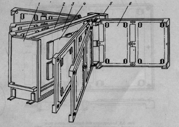 1 — передняя стенка; 2 — средняя стенка (каркас); 3 — кроссплата;
