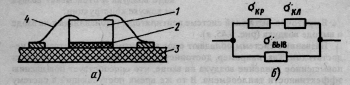 Значения внутренних тепловых проводимостей для бескорпусных интегральных микросхем и транзисторов берут из технических условий на элементы или определяют по тепловой схеме рис. 5.44, б. Исходя из способа установки кристалла на подложке (рис. 5.44, а) тепло от активной области кристалла стекает на подложку 3 через кристалл 1 (σ кр), слой клея 2 (σКЛ) и выводы 4 (σ выв).