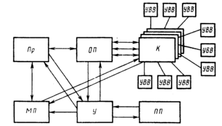 Построение структурной схемы поясняется примером схемы электрической структурной (рис. 3.4.1, где Пр — процессор; 0П — оперативная память; МП — местная память; ПП — постоянная память; У — управление; К — каналы, УВД - устройство ввода—вывода).Схема электрическая функциональная. На схеме электрической функциональной (Э2) показывают функциональные части аппаратуры, участвующие в процессе, и связи между этими частями. Функциональные части изображают, как правило, в виде условных графических обозначений, однако допускается применение прямоугольников. На схеме должны быть указаны: