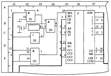 УГО цифровых элементов строится на основе прямоугольника и может содержать основное и два дополнительных поля (рис. 3.4.3 – элемент Р). Размер прямоугольного поля по ширине зависит от наличия дополнительных полей и числа помещенных в них знаков (меток, обозначения функций элемента), по высоте — от числа выводов, интервалов между ними и числа строк информации в основном и дополнительных полях. Ширина основного поля должна быть не менее 10 мм, дополнительных — не менее 5 мм, расстояние между выводами - 5 мм.