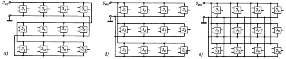 Уменьшение общих участков протекания токов элементов по шинам питания. Этот метод заключается в установке дополнительных перемычек в шинах питания и «земля», которые уменьшают длину общих участков протекания токов элементов. На рис. 6.2.4 представлены три варианта соединения элементов шиной питания и «земля». В первом варианте (а) переключение элемента, например Э12 (изменение тока потребления схемы), приводит к возникновению паразитной наводки в остальных одиннадцати элементах по шине питания и «земля». Во втором варианте (б) эта помеха в худшем случае воздействует только на четыре элемента, а в третьем варианте (в) помеха еще более уменьшается за счет введения дополнительных перемычек (распараллеливания).