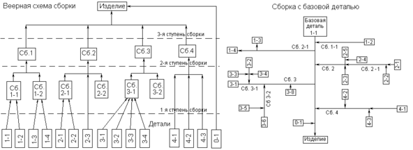 Разработка технологического маршрута сборки и монтажа РЭА начинается с расчленения изделия на сборочные элементы путем построения схем сборки. Элементами сборочно-монтажного производства являются детали и сборочные единицы различной степени сложности. Построение схем позволяет установить последовательность сборки, взаимную связь между элементами и наглядно представить Проект ТП. Сначала составляется схема сборочного состава всего изделия, а затем ее дополняют развернутыми схемами отдельных сборочных единиц. Расчленение изделия на элементы производится независимо от программы его выпуска и характера ТП сборки. Схема сборочного состава служит основой для разработки технологической схемы сборки, в которой формируется структура операций сборки, устанавливается их оптимальная последовательность, вносятся указания по особенностям выполнения операций.