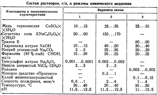 Для создания межслойных переходов в ПП и для изготовления проводящего рисунка плат используют, как правило, восстановительную ванну для меднения в одном из растворов, приведенных в таблице.