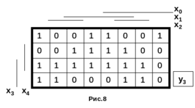 Представить логическую функцию Y3, заданную картой Карно (рис.8), в виде десятичного набора импликант, определяемых аргументами Х0, Х1, Х2, Х3, Х4, с весами 20, 21, 22, 23, 24 соответственно.