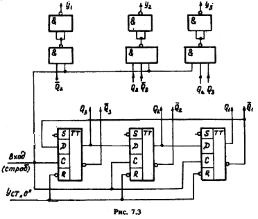 На рис. 7.3 представлена схема трехканального распределителя сигналов на счетчике Джонсона, реализованного на триггерах типа D c инверсной связью выхода