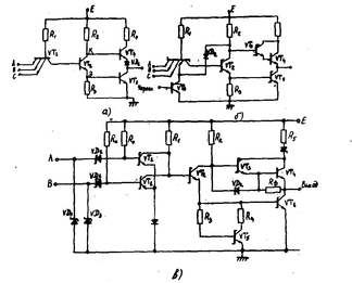 В трехвходовой схеме, показанной на рис. 3, а, второй транзистор VT2 представляет собой фазоразделительный каскад, обеспечивающий парафазный сигнал для управления транзисторами VT3 и VT4. Сопротивления резисторов R2 и R3 примерно одинаковы и составляют 0,25…0,33 от сопротивления R1, и поэтому для насыщения транзистора VT2 от него не требуется большого усиления по току.