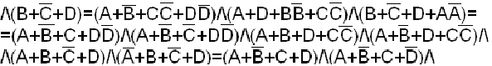 аналитическое выражение функции приводится с помощью соотношения AB+C=(A+C)(B+C) к конъюнктивной записи со скобками, причем в скобках должны стоять дизъюнкции отдельных переменных в прямой или инверсной форме;