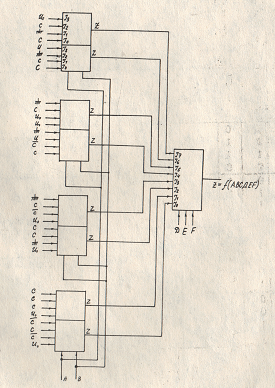 Чтобы создать схему, реализующую функцию шести переменных f(ABCDEF), переменные функции делят на две части A,B,C и D,E,F. В этом случае схемная реализация упрощается. Вместо задачи для шести переменных получаются две задачи при трех переменных, которые решаются следующим образом: