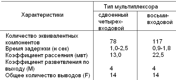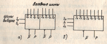 Из основных положений построения логических схем можно показать, что для реализации любой булевой функции n переменных достаточно иметь устройство, которое содержит 2n-1 схемы, реализующие соответствующим образом подобранные 2n-1 минтермов. Если функция обращается в единицу на числе наборов больше чем 2n-1, то нетрудно показать, что в этом случае будут обязательно склеивающиеся минтермы и, следовательно, потребуется меньшее количество оборудования. Исходя из этих предпосылок можно организовать внутреннюю структуру мультиплексора. Половина четырехвходового мультиплексора может реализовать любую из 256 функций трех аргументов (рис.4,а). При этом на шины выборки подаются сигналы двух любых аргументов, а на входные шины соответствующие сигналы третьего аргумента.