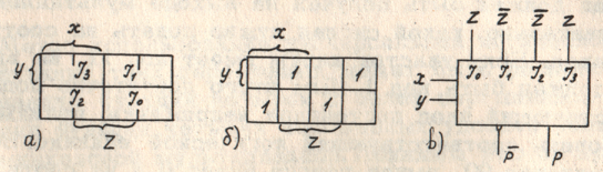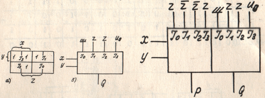 Таблица истинности (табл.24) показывает, что когда x и y равны 0, функция выхода S совпадает с z. Это означает, что на вход J0 нужно подать аргумент z. Когда x=0 и y=1 (код на шинах выборки 01), внутренние логические схемы мультиплексора срабатывают таким образом, что к этой комбинации подключается вход J1. Для этого случая таблица истинности показывает, что выход S будет равен 1 только тогда, когда z=0. Следовательно, на вход J1 (рис.6,в) нужно подать дополнение z, т.е.