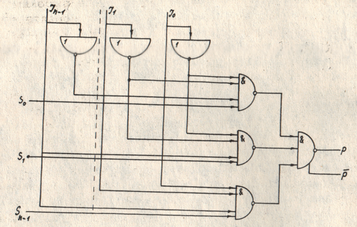 Составим логическую схему для переноса P(табл.24). На основании булева уравнения составим карту минимизации(рис.7,а). По карте минимизации составим логическую схему на половине сдвоенного четырехвходового мультиплексора (рис.7,б). В этой схеме на вход J0 подается потенциал, соответствующий сигналу 0(потенциал земли). На входы J1 и J2 подается входной сигнал z, так как функция обращается в единицу, когда z=1 и в нуль – когда z=0; на вход J3 подается сигнал, соответствующий единице, так как при любом значении z функция равна 1. Окончательно схема для одного разряда сумматора реализуется на одном сдвоенном четырехвходовом мультиплексоре (рис.8).