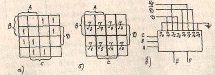 Составим таблицу истинности (табл.25) и карты минимизации как и в предыдущем случае (рис.9,а,б). Каждый участок карты приписывается каждому из восьми входов мультиплексора. Требуемая схема подачи входных сигналов определяется при рассмотрении карты в зависимости от того, какой код в них содержится – 00, 01, 10 или 11. Для данной функции схема подключения входов имеет вид (рис.9,в):