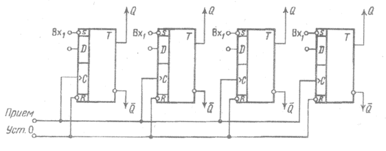 Регистр, предназначенный для работы с двоичными кодами, представляет собой совокупность триггеров, количество которых соответствует количеству разрядов в двоичном коде, и вспомогательных схем, позволяющих дополнительно реализовать следующие функции регистров: