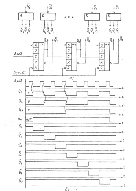 На рис. 3.19а приводится схема 8-канального однотактного распределителя сигналов, использующая трехразрядный счетчик на триггерах J – K и полный линейный дешифратор на элементах И — НЕ (управляющий сигнал в каналах представлен логическим нулем). Длительность управляющего сигнала равна периоду следования переключающих сигналов, поступающих с выхода счетчика (рис. 3.19б).