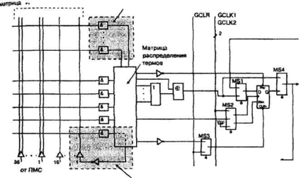 Для реализации сложных логических функций с большим количеством переменных, целесообразно использование разделяемых логических расширителей. Разделяемый логический расширитель формирует терм, инверсное значение которого передается матрицей размещения термов в локальную программируемую матрицу "И" и может быть использовано в любой макроячейке данного ЛБ.