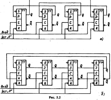Соединить синхровходы С всех 4-х триггеров типа J-К с пря-
