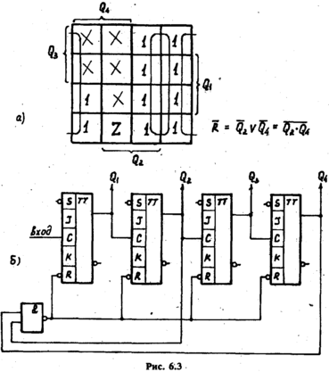 Схема декадного счетчика приведена на рис. 6.3, б.