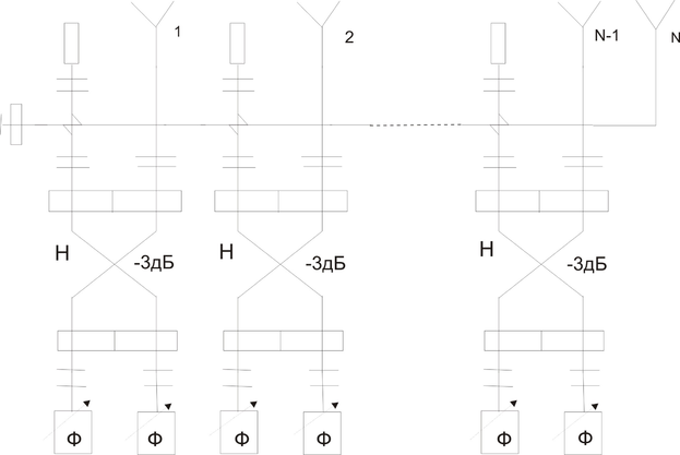 Анализируя написанное выше ,приходим к выводу ,что для нашей ФАР подходит схема (рис.2) последовательного деления мощности в виде закрытого тракта в которой в качестве элементов связи используются направленные ответвители .