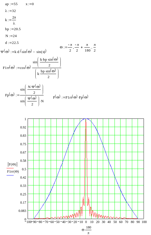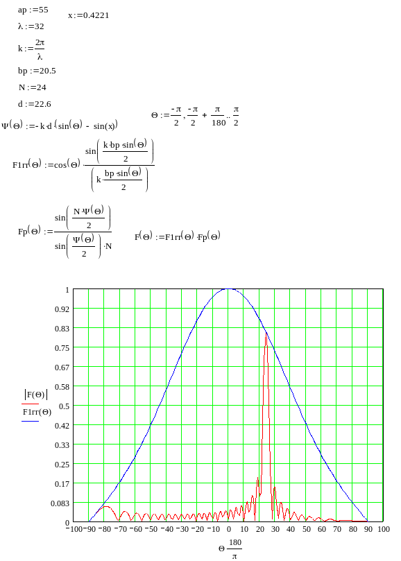 б) Расчёт ДН одиночного излучателя в вертикальной плоскости.