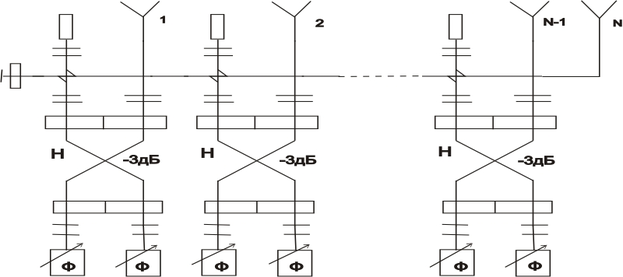 Делители в виде закрытого тракта выполняются по схемам последовательного и параллельного деления мощности .При последовательном делении мощности фазовращатели могут быть включены в боковые ответвления фидерного тракта ,идущие к излучателям .В этом случае в каждый из N фазовращателей проходит 1/N мощности ,а потери мощности определяются потерями ,вносимыми одним фазовращателем. Недостатком данной схемы является различная электрическая длина пути от входа антенны до излучателей ,что может привести к фазовым искажениям на краях частотного диапазона .Для устранения фазовых искажений в боковые ответвления необходимо включать компенсационные отрезки фидера .