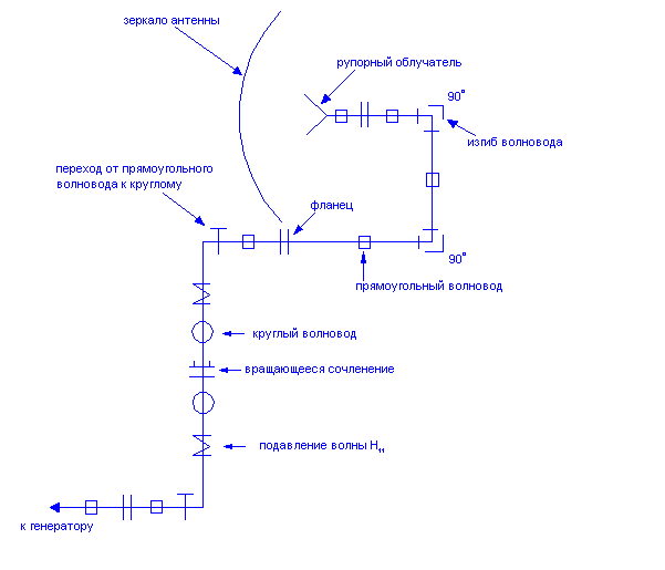 От генератора идет сигнал по прямоугольному волноводу, дальше он поступает во вращающиеся сочленение на основе круглого волновода. Основной круглый волновод, вращающиеся сочленение, сверху и снизу заканчивается гасящими объемами, которые представляют собой короткозамкнутые круглые волноводы. Внутри основного круглого волновода размещены резонансные металлические кольца, предназначенные для подавления волны Н11. Дальше идет прямоугольный волновод, соединенный фланцами. Но и затем с помощью изгибов подводят двухщелевой облучатель напротив зеркалу.