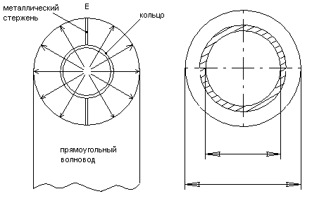 Размер широкой стенки волновода: 0,6 Размер узкой стенки волновода: b</2; b<1,85см; Определив по приведенным формулам ориентировочные размеры a и b, далее по справочнику выбираем стандартный волновод: a=23 мм; b=10мм. Материал стенок волновода – латунь. Поперечное сечение такого волновода имеет вид: Максимальная (предельная) мощность, пропускаемая волноводом с волной Н10, определяется соотношением: Е=30 кВ/см – напряженность электрического поля, при которой происходит пробой в воздухе. Допустимой мощностью называют предельную мощность пропускания, умноженную на коэффициент запаса электрической прочности, учитывающий неоднородности, вызывающие местные концентрации электрического поля, климатические факторы и наличие стоячей волны. Допустимая мощность Рдоп определяется как: Рдоп = (1/3…1/5)Рпред. Рдоп=165кВт. При повороте волновода на 900, производить скругление изгиба не требуется, так как данная антенна работает в достаточно узкой полосе частот. Параметры круглого волновода: Осевая симметрия поля, необходимая для сохранения постоянства передачи электромагнитной энергии при вращении подвижной части волноводного тракта относительно неподвижного, имеется в круглых волноводах с симметричными волнами типа Е01 и Н01. Поперечное сечение такого волновода имеет вид: Из-за сложности возбуждения волны Н01 в круглом волноводе в чистом виде (одновременно возбуждаются волны типа Н11, Е01, Н21,Е11) использование вращающихся сочленений на основе данного типа волны не получило широкого практического применения. Диаметр основного круглого волновода сочленения D определяется из условия распространения волны Е01 (D>0,76) и затухания высших типов волн (D<0,97), т.е. 2,81 см D = 3,34 см. Rв = 1,67 см. Проверка круглого волновода на максимальную пропускаемую мощность не производится, так как в прямоугольном волноводе с волной Н10 электрический пробой наступает быстрее, чем пробой в круглом волноводе при любом типе волны. 1=6,98 см; 1=4,87см – длины волн в круглом волноводе. Дроссельно-фланцевые соединения: Для соединения отрезков волноводных линий передачи используются дроссельные соединения в круглых, вращающихся друг относительно друга, волноводах и контактные фланцевые соединения в прямоугольных волноводах. В качестве дроссельной секции в круглом волноводе применяется полуволновая замкнутая линия, состоящая из двух параллельных четвертьволновых участков, длиной 1,75см., с разными волновыми сопротивлениями. Использование притертого фланца при тщательной обработке и строгой параллельности фланцевых поверхностей позволяет получить в месте соединения двух отрезков волноводных линий хороший электрический контакт. Переход от прямоугольного волновода к круглому: Для согласования волнового сопротивления прямоугольного волновода с круглым волноводом используются индуктивные диафрагмы, которые впаиваются с двух сторон в прорези в узких стенках прямоугольного волновода, емкостные диафрагмы в виде кольцевого выступа в круглом волноводе, индуктивные штыри, впаиваемые в прорези в широкой стенке прямоугольного волновода, положение и размеры которых подбираются экспериментально. Подавление паразитных типов волн: При переходе от прямоугольного волновода с волной Н10 к круглому волноводу в последнем возникают волны: рабочая - Е01 и более низкая паразитная - Н11. Волна Н11 имее
