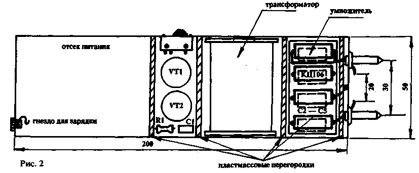 Основу прибора составляет преобразователь постоянного напряжения (рис.1). На выходе прибора я применил умножитель на диодах КЦ-106 и конденсаторах 220 пф х 10 кв. Питанием служат 10 аккумуляторов Д-0,55. С меньшими - результат чуть хуже. Можно применять и батареи "Крона" или "Корунд". Важно иметь 9- 12 вольт. Аккумуляторы удобны только тем, что их можно заряжать.