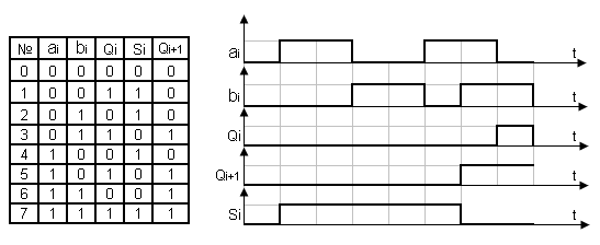 Таблица истинности и временные диаграммы сумматора: