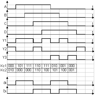 Построить временные диаграммы работы автомата в точках: A,B,С,Y1,Y2,Y3,ai,bi,ci,Si,Qi+1.