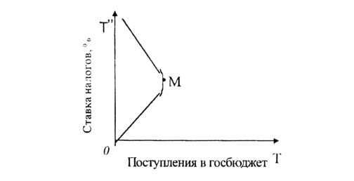 Зависимость налоговых поступлений от величины налоговой ставки была описана А. Лаффером. Согласно его кривой, увеличение налоговых ставок приводит к росту налоговых поступлений лишь до определенных пределов (точка М). Дальнейшее увеличение налоговой ставки приведет к чрезмерности налогового бремени. Оно ведет к уходу многих производителей с рынка из-за банкротств и к уклонению от налогов. Результатом указанных действий становится нежелательное уменьшение налоговых поступлений в казну.