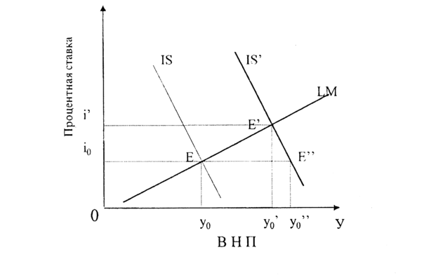 Если экономика первоначально находилась в равновесии в точке Е, то мы движемся (при постоянной ставке процента) к точке Е". В точке Е" рынок товаров находится в равновесии, плановые расходы равны выпуску продукции. Но на фондовом рынке нет равновесия. Доход увеличивается и, следовательно, спрос на деньги становится выше. При ставке процента io спрос на деньги превышает предложение денег. Этот избыток спроса на реальные денежные балансы увеличивает ставку процента. Но когда ставка процента растет, частные расходы сокращаются. Фирмы снижают планируемые инвестиции и, таким образом, совокупный спрос понижается. Регулирование завершается в точке Е', где и товарный, и денежный рынки находятся в равновесии - это новая точка равновесия.