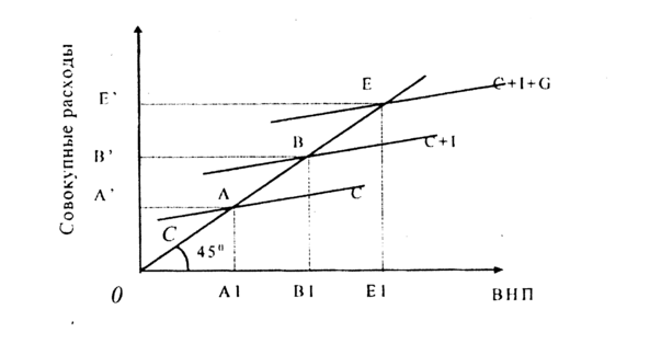 Исходя из данных ограничений влияния фискальной политики на совокупный спрос, предположим, что налоги равны нулю. По оси Х отложим величину ВНП, по оси Y - совокупные расходы, которые состоят из расходов населения, предприятий и государства на приобретение материальных благ и услуг. Состояние, при котором вся величина ВНП будет потреблена населением, предприятиями и государством, т. е. будет равна их расходам, можно графически изобразить в виде прямой линии, идущей к оси Х под углом 45°. В любой точке этой прямой совокупные расходы равны ВНП в этой точке. Теперь введем график потребления СС. Точка А показывает то состояние, когда расходы населения равны его потреблению. В результате закупок предприятий спрос на рынке увеличивается на величину инвестиций C+I. Теперь совокупные расходы будут равны потреблению населения и инвестициям предприятий. В точке В достигается такое состояние, когда на весь произведенный ВНП в объеме ОВ - будет предъявлен спрос населения и предприятий.