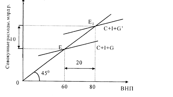 Покажем суть этого мультиэффекта. Предположим, что при данном уровне потребления, инвестиций и государственных расходов равновесное состояние макроэкономики достигается и точке Е при объеме ВНП, равном 60 млрд р.